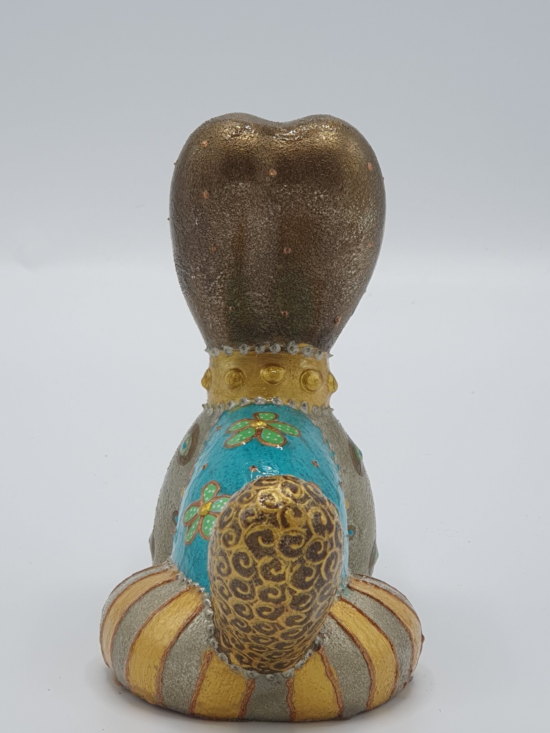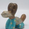 Deze speelse keramieken hond is een kleurrijke toevoeging aan elk interieur. Met zijn unieke ontwerp in brons, bruin, goud en turquoise, valt dit sculptuur direct op. Het beeld is versierd met vrolijke cirkel- en bloemmotieven die een levendige uitstraling geven. Perfect voor binnengebruik, dit kunstwerk brengt een speelse sfeer in uw woonkamer, kantoor of kinderkamer. Het is vervaardigd door Urmila Massaar, bekend om haar creatieve en opvallende ontwerpen. Met een afmeting van 17 cm lang, 7 cm breed en 12 cm hoog, past het gemakkelijk op een boekenplank of bijzettafel. Dit vrolijke beeld is niet alleen een kunstwerk, maar ook een uniek cadeau voor liefhebbers van bijzondere kunst.
