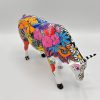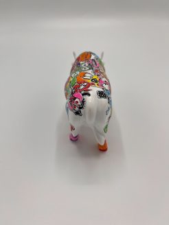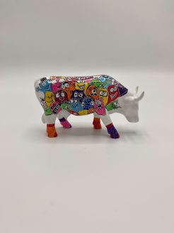 Het beeldje stelt een koe voor, bedekt met een bonte verzameling van kleurrijke, cartooneske gezichten en figuren. De heldere kleuren zoals oranje, roze, geel, groen, blauw en rood worden prachtig gecombineerd met gedetailleerde patronen, wat zorgt voor een vrolijk en visueel aantrekkelijk geheel. Elke kant van de koe onthult verschillende grappige en eigenzinnige gezichten, die samen een feestelijk en betoverend kunstwerk vormen.