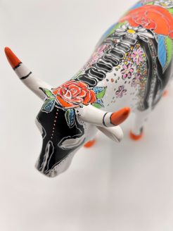De kop van de koe heeft een dramatisch zwart-wit maskerdesign, wat haar een catrina-achtige uitstraling geeft, terwijl de feloranje hoorns en hoeven een energieke en levendige toets toevoegen. Op de rug van het beeld siert een opvallende roos, een traditioneel symbool van liefde en herinnering, omringd door weelderige bloemen en delicate versieringen.