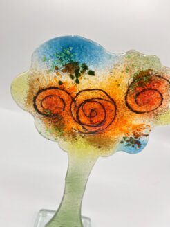 Een kleurrijk kunstwerk vol fantasie en levendigheid – deze glazen boom van 32 cm hoog is een speelse interpretatie van de natuur, handgemaakt met oog voor detail en kleurbeleving. De brede, luchtige kruin is een explosie van warme oranje- en roodtinten, gecombineerd met fris groen en hemelsblauw, alsof de boom een stukje van een zomerse zonsondergang vasthoudt.