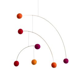 Deze hangende mobiel met vilten ballen en messing voegt kleuren en vrolijke gedachten toe aan uw interieur. De gebogen lijnen impliceren de beweging van de stuiterende kleurrijke vilten ballen.