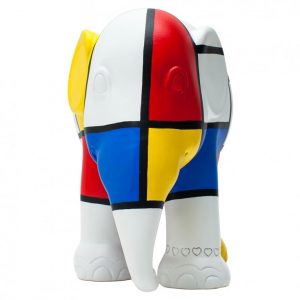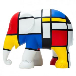 Dompel jezelf onder in de avant-gardistische wereld van het olifantenbeeld ‘Hommage aan Mondriaan’, een eerbetoon aan de grondlegger van de moderne kunst, Piet Mondriaan. Deze boeiende olifantsfiguur is geïnspireerd op de abstracte schilderijen van Mondriaan en vertaalt de essentie van zijn werk naar een driedimensionaal meesterwerk. Verkrijgbaar in verschillende maten, van een kleine olifantsdecoratie tot een statement olifantensculptuur, dit stuk is geschikt voor diverse ruimtes.