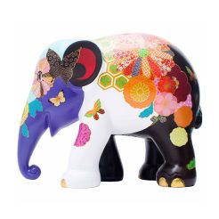 Stap in de wereld van het olifantenbeeld “Kiku”, een sierlijke creatie geïnspireerd op een antieke kimonostof, rijk aan kleuren en dramatische patronen. De liefde van de kunstenaar voor de levendige tinten en decoratieve details van kimonostoffen wordt prachtig vertaald in dit kleine olifantenbeeldje. De toevoeging van vlinders brengt een diepgaande boodschap van hoop en vrijheid met zich mee, een oprechte wens dat olifanten kunnen gedijen in een veilige en beschermde omgeving.
