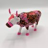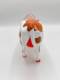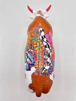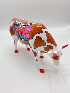 Dit kunstwerk heet “Koei in Bloei,” beschilderd door Ellen Moorman. Het beeldje is een prachtig eerbetoon aan de natuur, waarbij een koe in bloei staat met een weelderige bloemenpracht op haar rug. De beschildering combineert het natuurlijke patroon van de koe in een lichtbruine kleur met levendige bloemen en speelse motieven. De bloemen op de rug zijn kleurrijk en gedetailleerd, met schakeringen van roze, paars, geel en oranje, die het midden van de rug bedekken. De hoeven en hoorns zijn beschilderd met een opvallend rood-wit stippenpatroon, wat een speels contrast vormt met het bloemenmotief.