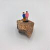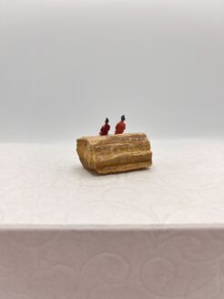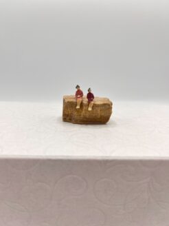 Een subtiel tafereel vol verstilling: twee miniatuurfiguren zitten samen op een stukje versteend hout, alsof ze verwikkeld zijn in een rustig gesprek of gewoon genieten van elkaars gezelschap. Dit handgemaakte kunstwerk van Herma Kraan is slechts 2 cm hoog, maar straalt een wereld aan sfeer en detail uit.