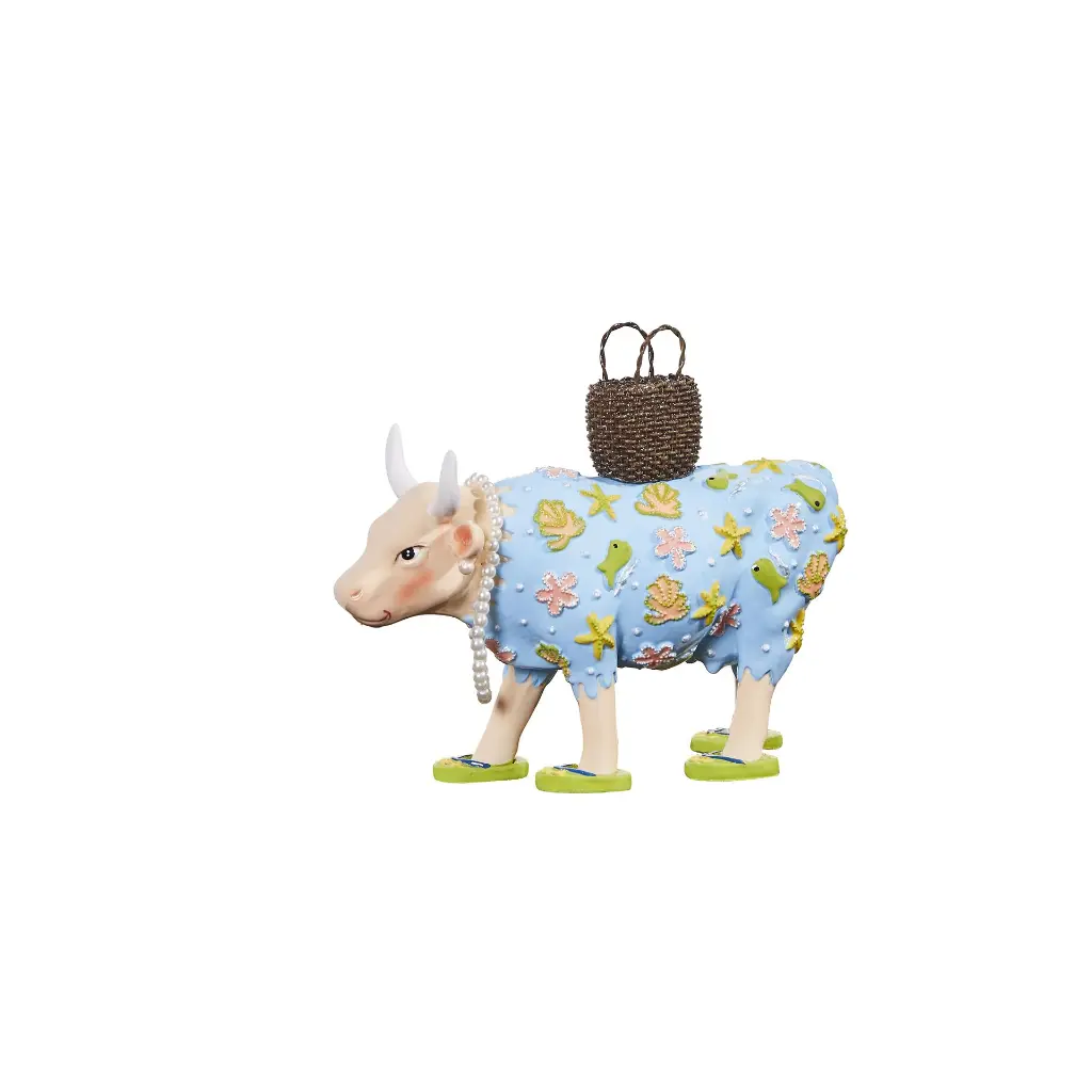 Zomerse elegantie op vier poten. Miss Palm Beach, ontworpen door kunstenares Lynn Weisbach voor CowParade Atlanta 2003,straalt pure strandcharme uit. Met haar lichtblauwe huid bezaaid met tropische bloemen, vissen en zeesterren, een parelketting om haar hals en stijlvolle strandtas op de rug, is ze klaar voor een dag aan zee. Deze vrolijke verschijning brengt een vleugje vakantiegevoel in elke collectie. Een kunstzinnige knipoog naar zon, zee en strand – altijd met je mee te nemen.