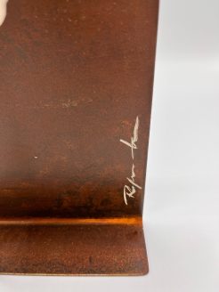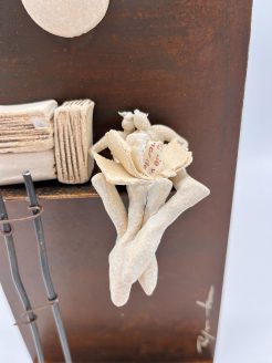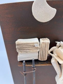 Dit prachtige en intrigerende kunstwerk van Roser Oter, getiteld “Onder de Maan,” combineert subtiele aardse tonen met een minimalistische, maar diep expressieve vormgeving. Het stuk bestaat uit een robuust, roestkleurig metalen paneel dat als achtergrond dient voor delicate keramische elementen. Een halve maan zweeft bovenaan het werk, en eronder bevinden zich gestileerde vormen die doen denken aan boeken, een ladder en een mysterieuze, abstracte bloem of figuur, alles uitgevoerd in natuurlijke tinten van keramiek.