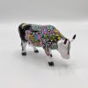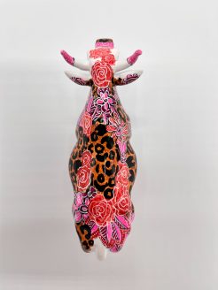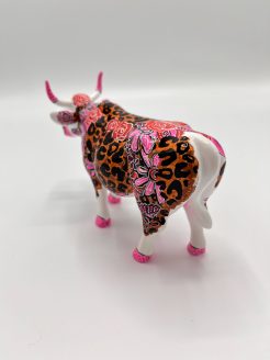 De achtergrond van het beeldje is bedekt met een levendige bruin-zwart panterprint, die een gewaagde en moderne uitstraling creëert. Daaroverheen zijn delicate roze en rode bloemen geschilderd, wat het beeldje een verrassende, vrouwelijke twist geeft. De hoorns, hoeven en snuit van de koe zijn in een speelse roze kleur afgewerkt en voorzien van een stippenpatroon, wat zorgt voor een uniek accent en een vrolijke uitstraling.