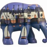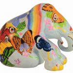 “Ik wist dat ik mijn olifant wilde laten blinken, maar het was tijdens het skiën over een met bomen omzoomde piste met de schaduwen van de bomen, onderbroken door zonlicht op glinsterende sneeuw, dat mijn ideeën duidelijk werden. Sylvan Sparkle is bedekt met een selectie junglebladeren, waaronder bananenbladeren, met plekken versierd met sprankelende juwelen van ‘saffieren’, topaas en diamanten.” – Lorna Green