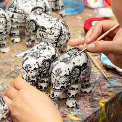 Verkrijgbaar in verschillende maten, van charmante olifantenbeeldjes tot statement-stukken, deze olifantendecoratie vangt de essentie van Thaise decoratie en is een perfect olifantencadeau of een betekenisvolle toevoeging aan je eigen ruimte. “The Journey” weerspiegelt niet alleen de geschiedenis, maar ondersteunt ook de voortdurende inspanningen om de soort te beschermen. Geef uw interieur een boost met deze unieke mix van traditie en moderniteit.